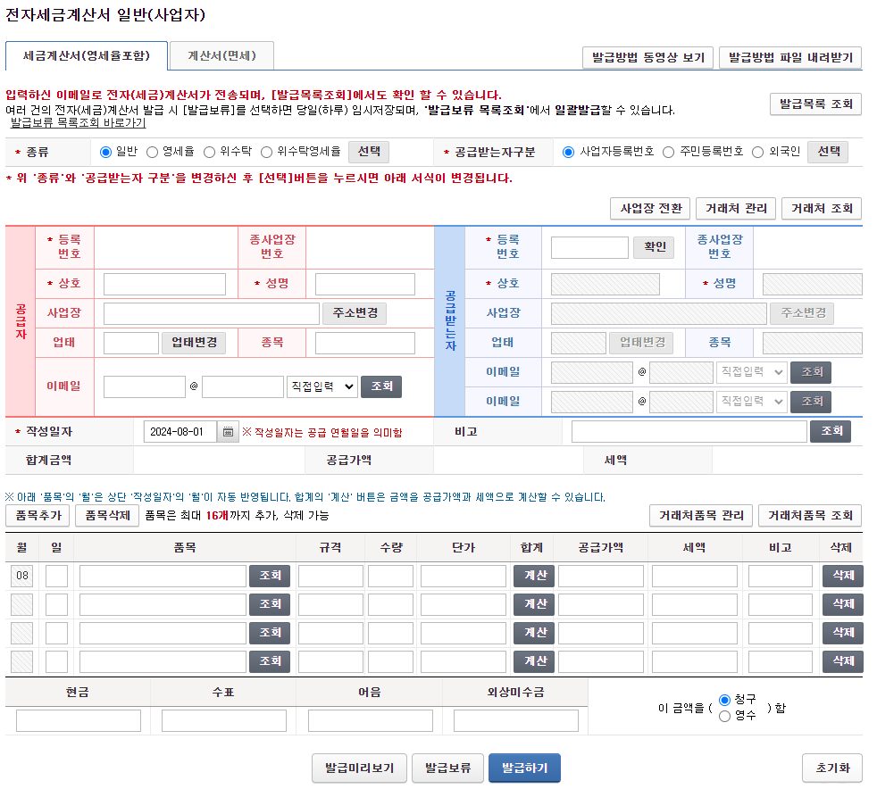 - 발행 필수 조건: 직전 연도 매출이 4,800만 원 이상인 경우, 간이과세자는 세금계산서를 발행해야 합니다. 이때, 종이 세금계산서와 전자세금계산서 중 선택할 수 있습니다.