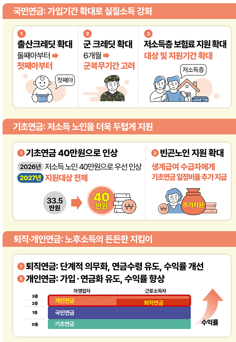 최근 정부는 국민연금을 장기적으로 지속 가능한 제도로 개편하기 위한 개혁안을 발표했습니다. 이번 개혁안은 국민의 부담을 최소화하면서 연금 재정의 안정성을 높이고, 노후 소득 보장을 강화하는 데 중점을 두고 있습니다. 이번 글에서는 국민연금 개혁안 내용 적용시기 발표 정리를 구체적으로 살펴보겠습니다.