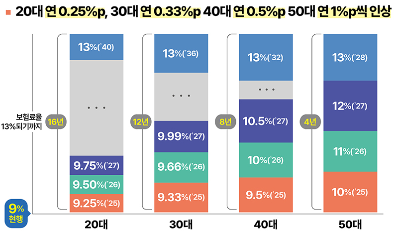 국민연금 보험료율은 현재 9%에서 2025년부터 단계적으로 13%까지 인상됩니다. 이번 개혁안에 따라 보험료율은 세대별로 차등 적용될 예정입니다. 50대는 매년 1%p씩 인상되어 2028년에는 13%를 내고, 20대는 매년 0.25%p씩 인상하여 16년에 걸쳐 부담을 완화할 계획입니다.