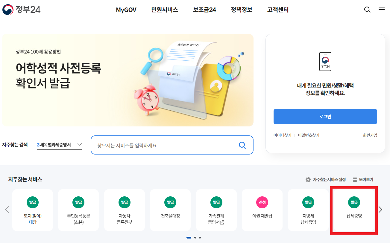 1. 정부24 접속: 정부24 홈페이지에 접속하여 '납세증명' > 발급하기를 클릭합니다.