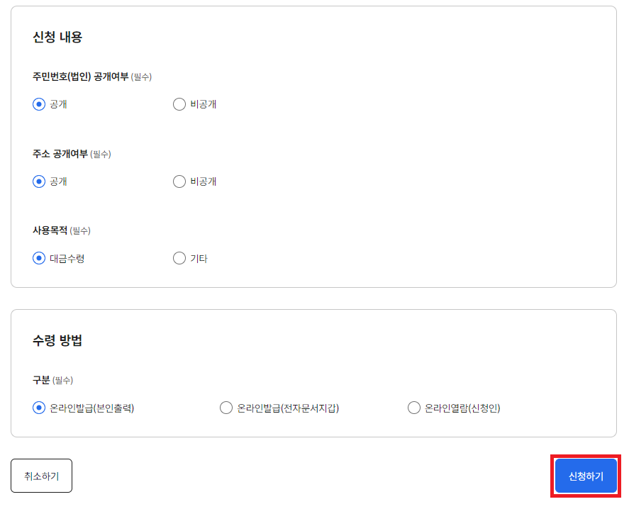 4. 신청내용, 수령방법 선택: 신청인 정보를 확인하고 신청내용과 수령방법을 선택 후 신청하기를 클릭합니다.