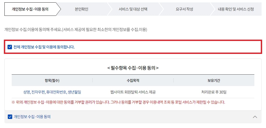 6. 내용 확인 및 서비스 신청: 회원 탈퇴 신청을 완료하고 신청내역을 확인합니다.