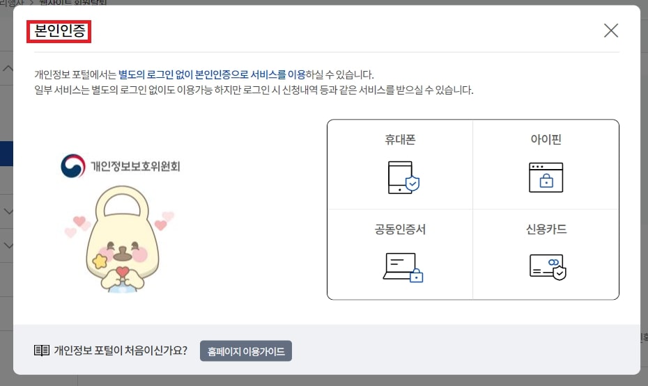 3. 본인인증: 휴대폰, 아이핀, 공동인증서, 신용카드 중 골라 본인인증과 본인확인을 합니다.