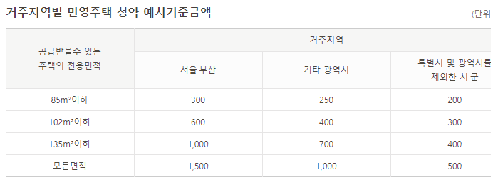 민영주택의 1순위 조건에서 가장 중요한 요소는 예치금입니다. 지역과 주택 면적에 따라 필요한 예치금이 다릅니다.- 예치금 기준: