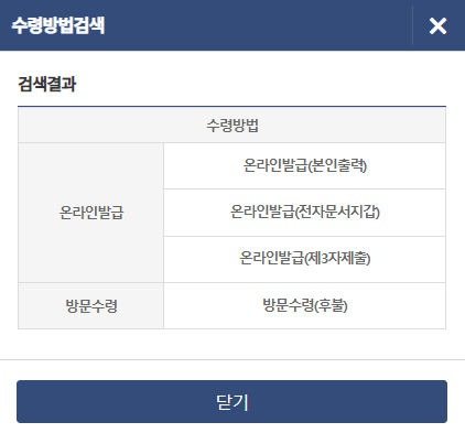 6. 수령방법 선택 및 제출: 수령방법을 선택하고 민원신청하기를 클릭합니다.
