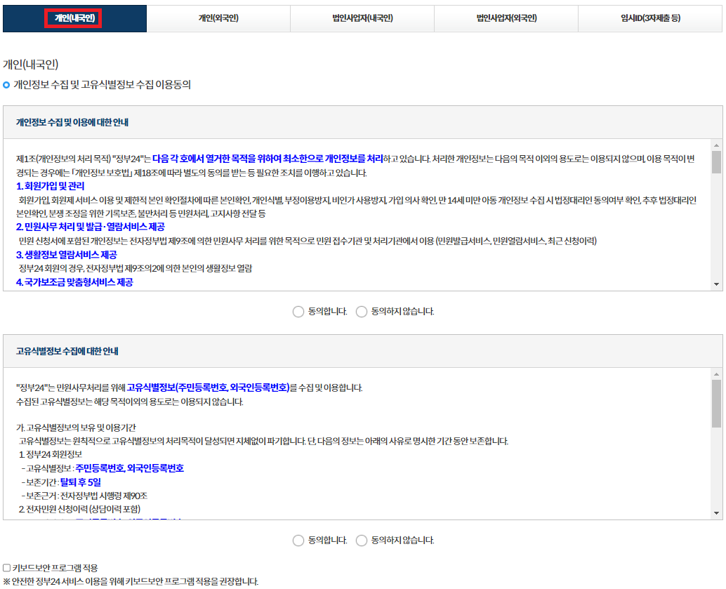 4. 정보 입력: 개인 또는 법인으로 선택하여, 해당하는 인적 정보를 입력합니다. 개인은 이름과 주민등록번호를, 법인은 법인명, 법인등록번호 등을 정확하게 기입해야 합니다.