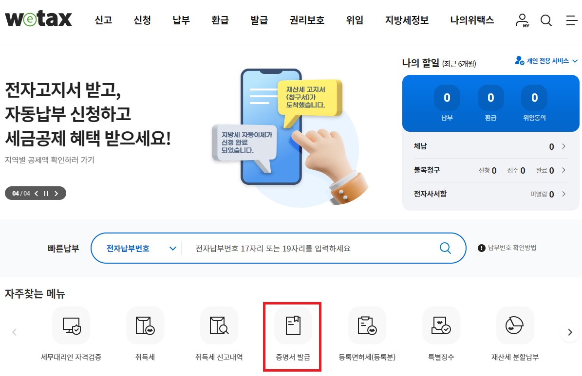 1. 위택스 홈페이지 접속: 위택스에 접속하여 로그인을 진행합니다. 로그인 후, 자주 찾는 메뉴에서 '증명서 발급'을 클릭합니다.