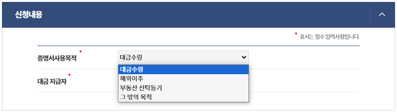 5. 신청 내용 작성 및 제출: 신청 내용을 작성한 후, 증명서 사용 목적을 선택합니다.