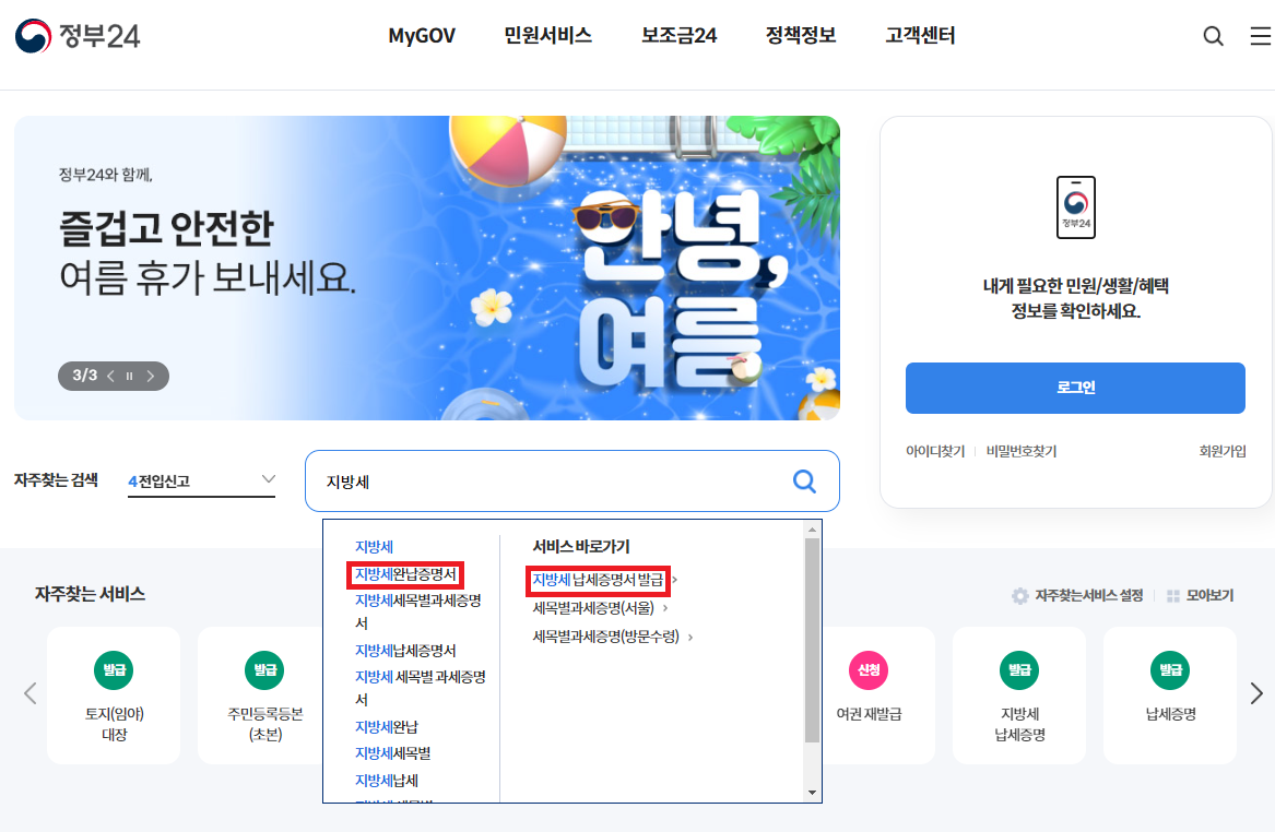 2.서비스 검색 및 선택: 정부24 메인 페이지에서 자주 가는 서비스에 '지방세납입증명'을 클릭합니다. 만약 해당 서비스가 보이지 않으면, 검색창에 '지방세'를 입력하여 '지방세납세증명서 발급'을 선택합니다.