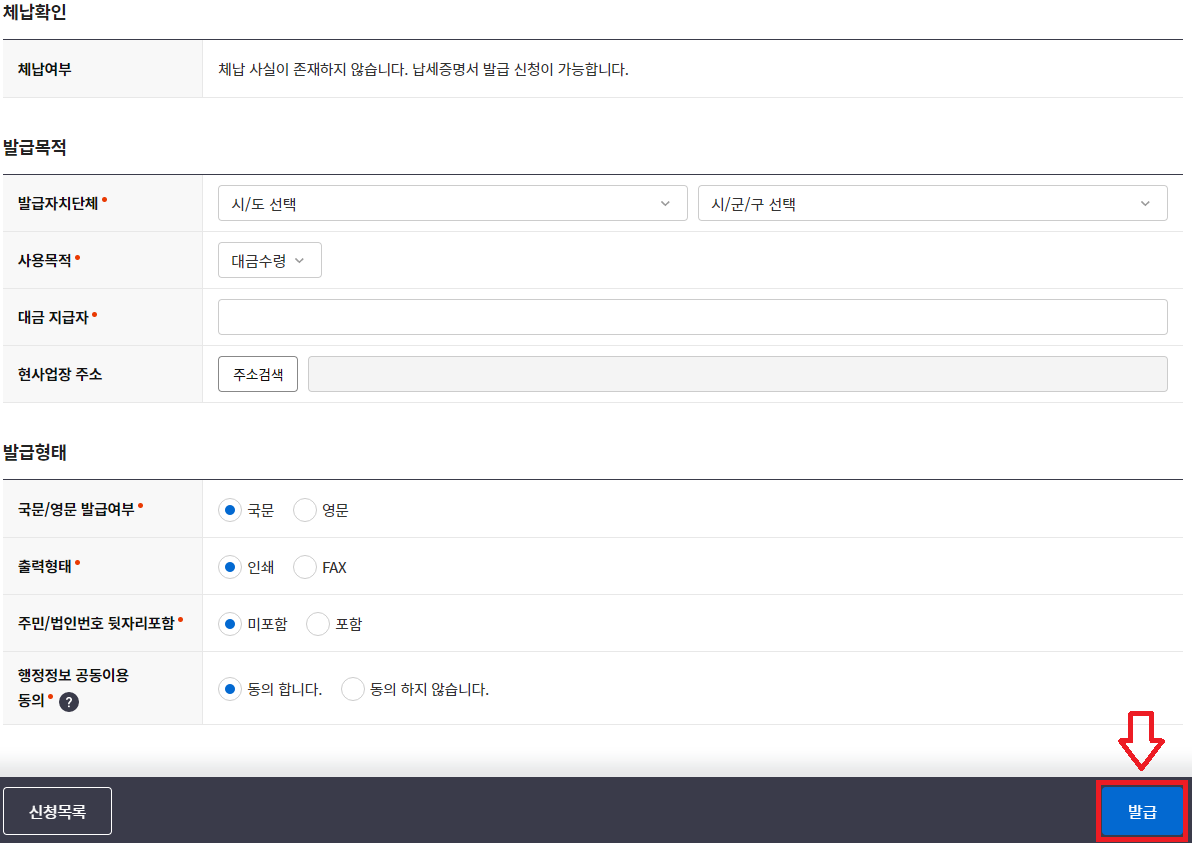 3. 정보 입력 및 발급 신청: 지방세 납세증명서 발급을 위해 필요한 정보를 입력하고, 발급 자치단체와 사용 목적을 선택합니다. 발급형태를 선택한 후, 발급 버튼을 클릭하여 증명서를 신청합니다.