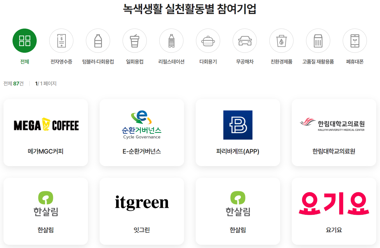 - 실천 활동 선택: 회원 가입 후 제공되는 다양한 녹색생활 실천 활동 목록에서 자신이 참여할 활동을 선택합니다. 실천 항목으로는 전자영수증 발급, 텀블러 이용, 리필스테이션 이용 등이 있습니다.