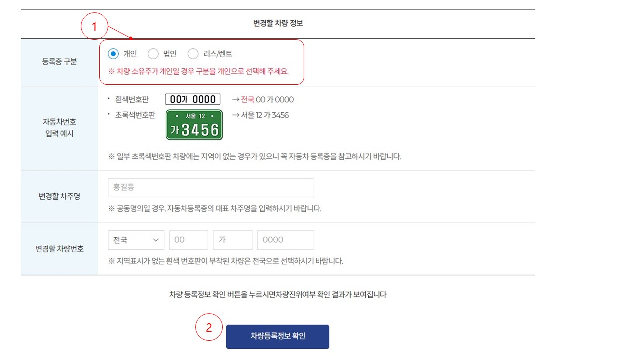 차종 및 명의변경을 원하는 경우 '차종/명의변경' 메뉴를 선택하여 진행하면 됩니다. 절차는 등록 방법과 비슷하여 생략하겠습니다.