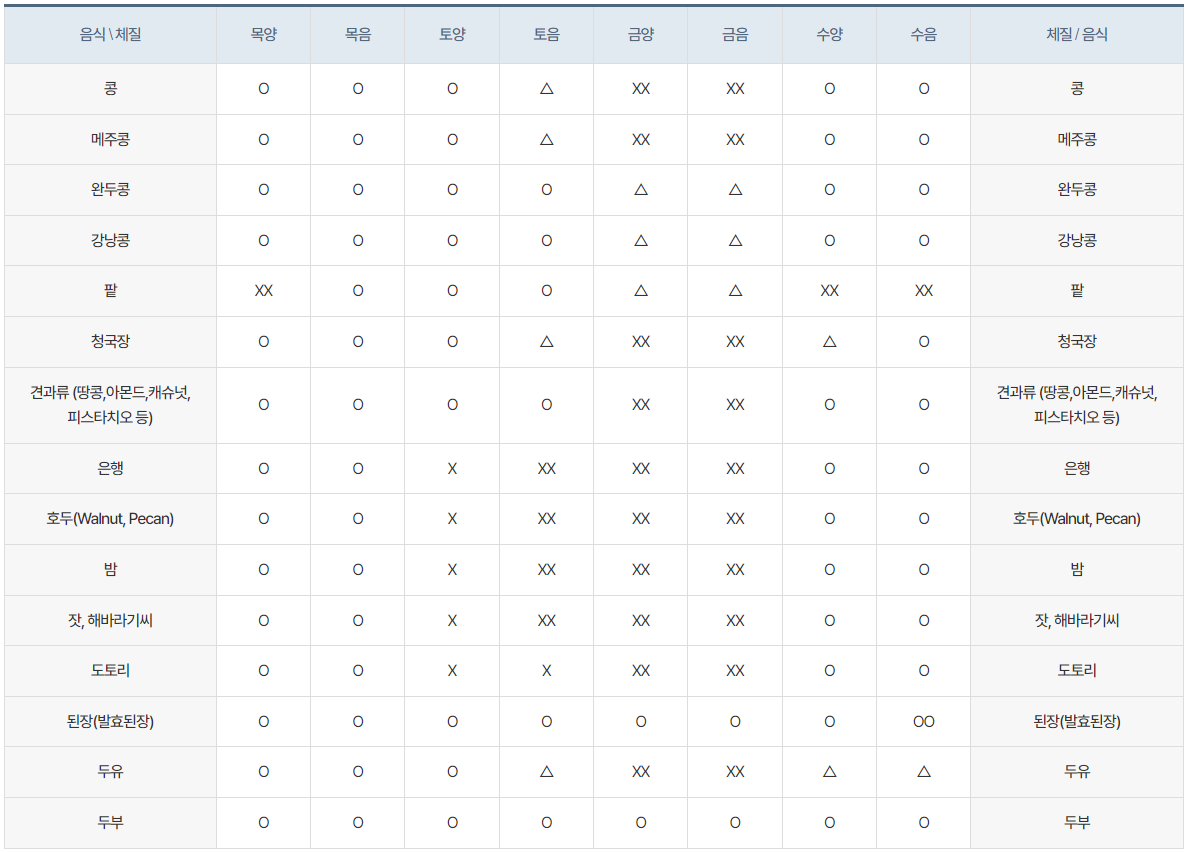 - 권장 음식: 소고기, 돼지고기, 푸른 잎 채소, 콩류